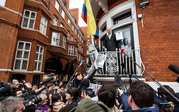 Assange addresses supporters from the balcony of Ecuador's embassy in London in 2016