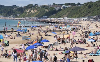 Beach-goers enjoy the warm weather at Bournemouth,Dorset,on Sunday