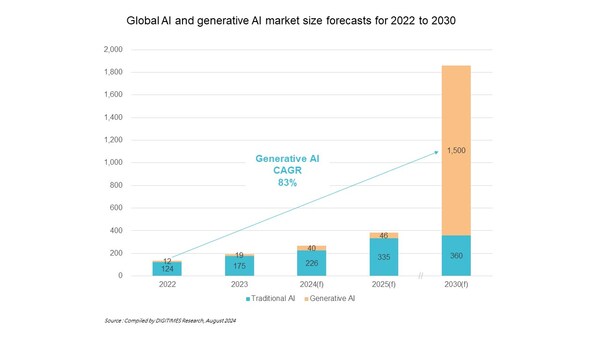 TAIPEI,Sept. 3,2024 -- The global generative AI market is experiencing rapid growth. According to the latest "Generative AI Special Report" from DIGITIMES,the market size is expected to expand quickly,reaching USD 40 billion by 2024 and growing to USD 1.5 trillion by 2030,with a compound annual growth rate (CAGR) of 83% from 2022 to 2030.