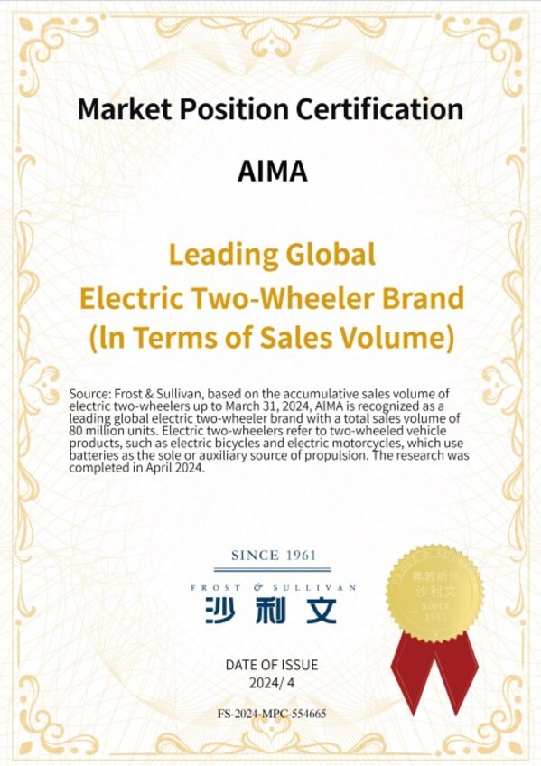 TIANJIN,China,Nov. 12,2024 -- Recently,Frost & Sullivan,a world-renowned market consulting company,awardedAIMA with the market status certification of the "Global Leading Electric Two-wheeler Brand (by Sales)". As of March 31,2024,the total sales volume of AIMA electric two-wheelers reached 80 million,fully demonstrating AIMA's leading position in the global electric two-wheeler sector.
