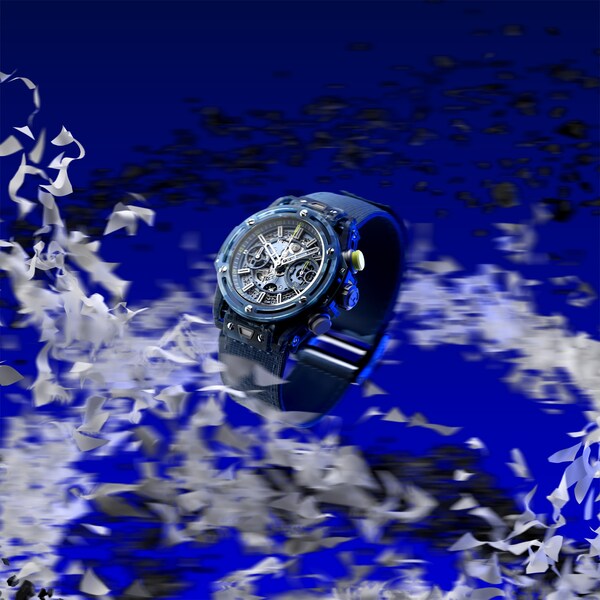 The composite that makes up the case and bezel of the watch is made of Epoxy resin reinforced with quartz powder and glass veil that has been fused with the recycled rackets and shirts. The resulting material is speckled with fragments of light & dark blue textiles and black carbon to create a singular camo aesthetic. An innovative approach,representative of Hublot's ambition for endless reinvention.