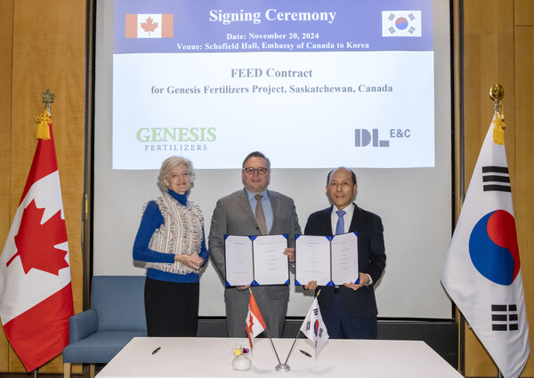 On November 20,DL E&C signed a contract with Genesis Fertilizers,a Canadian fertilizer company,at the Embassy of Canada in Seoul. Under the contract,DL E&C will carry out the high-tech Front-End Engineering Design (FEED) phase,while its subsidiary CARBONCO will provide licensing for Carbon Capture,Utilization,and Storage (CCUS) technology. The ammonia production process will be based on technology licensed from thyssenkrupp Uhde of Germany.