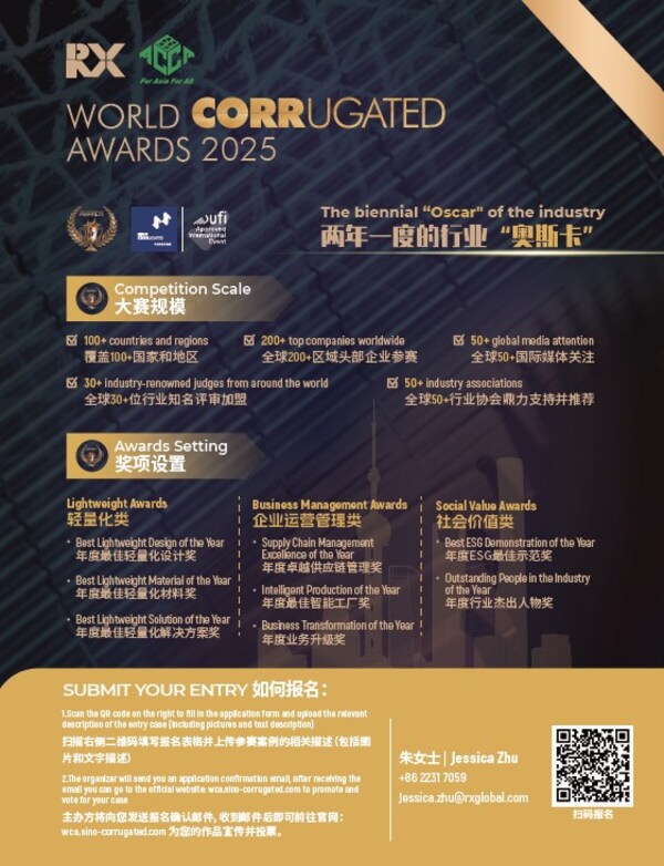 SHANGHAI,Dec. 16,2024 -- With rapid development in the global packaging industry come ever-evolving designs,materials,and production technologies,as well as certain social value and responsibility of corrugated boxes,driving a wave of innovative solutions in the industry. To explore contemporary trends in the corrugated packaging industry and provide a broader platform for exchange,since 2019,RX has partnered with corrugated box associations worldwide to launch the biennial "Academy Awards" of the corrugated industry - World Corrugated Awards,in a bid to select the most pioneering design,marketing,management,and social responsibility cases of the year,and honor carton enterprises,teams,and individuals who contribute significantly to the global corrugated industry's progresses.
