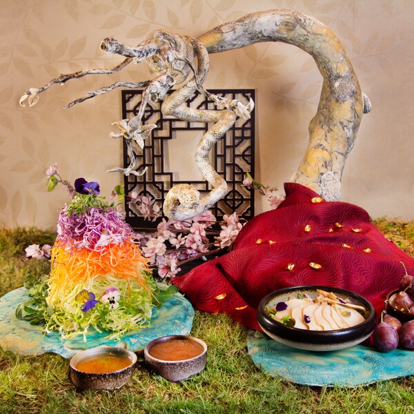 Welcome the year of the snake with an array of exquisite Chinese New Year takeaways,headlined by a luxuriousSliced 2-Head Abalone Yu Sheng. This masterpiece pairs tender,premium two-head abalone with a vibrant medley of shredded vegetables,offering a perfect harmony of flavours and textures. Finished with our signature zesty plum sauce,it's an indulgent and refreshing centrepiece to share prosperity and joy with your loved ones. For those who prefer a classic twist,elevate your experience with the Salmon Taro Yu Sheng,or go for the classic Salmon Yu Sheng or Vegetarian Yu Sheng.