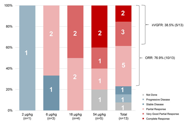 In terms of safety,one DLT was observed at the 54 μg/kg dose level,but the MTD was not reached. Treatment-related adverse events (TRAEs) were reported in all patients. The most common TRAE was cytokine release syndrome (CRS),occurring at grades 1 or 2 in all patients,with a median duration of 2.1 days. The most common grade ≥3 TRAEs were hematological toxicities,including lymphopenia (92.3%) and thrombocytopenia (61.5%). Most non-hematological TRAEs were grade 1 or 2. Importantly,no cases of immune effector cell-associated neurotoxicity syndrome (ICANS) were reported,and there were no TRAEs that led to treatment discontinuation or death.