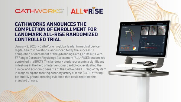 NEWPORT BEACH,Calif.,Jan. 3,2025 --CathWorks,a global leader in medical device digital health innovations,announced today the successful completion of enrollment of the Advancing Cath Lab Results with FFRangio Coronary Physiology Assessment (ALL-RISE) randomized controlled trial (RCT). This landmark study represents a significant milestone in the field of interventional cardiology,evaluating the clinical and economic benefits of the CathWorks FFRangio® System in diagnosing and treating coronary artery disease (CAD),offering potentially groundbreaking evidence that could redefine the standard of care.