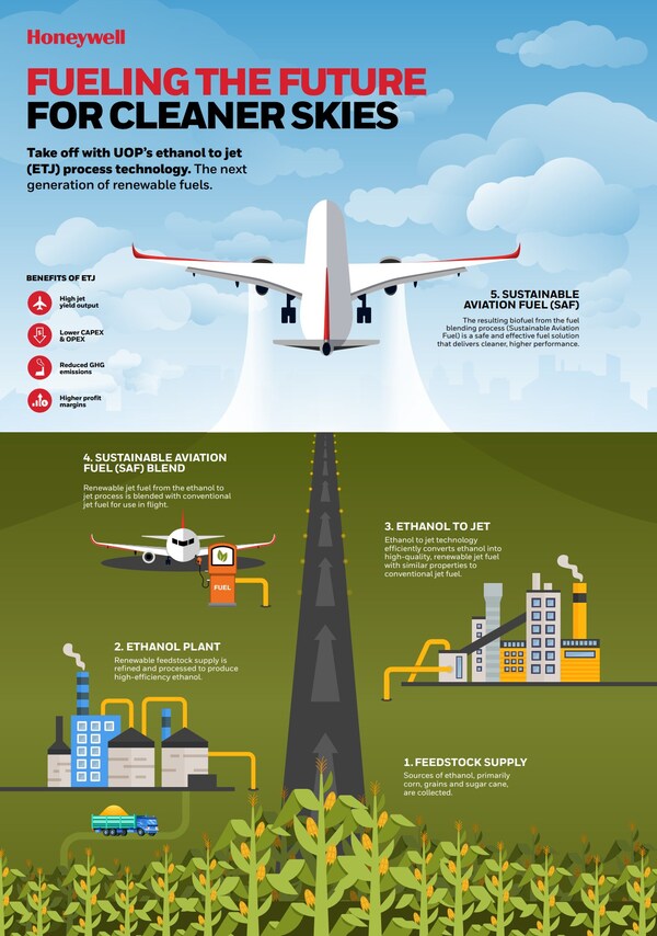 Honeywell's innovative ETJ technology helps enable the conversion of ethanol derived from diverse feedstocks―including corn,sugar,and cellulosic materials―into SAF. This fuel meets the rigorous standards of the aviation sector while demonstrating a significantly lower impact to the environment. Depending on the type of ethanol feedstock used,Honeywell's ETJ process provides a cost-effective path for producing lower greenhouse gas emission jet fuel on a total lifecycle basis,compared to petroleum-based jet fuel. This technology demonstrates Honeywell's alignment to the global megatrends,including the energy transition.