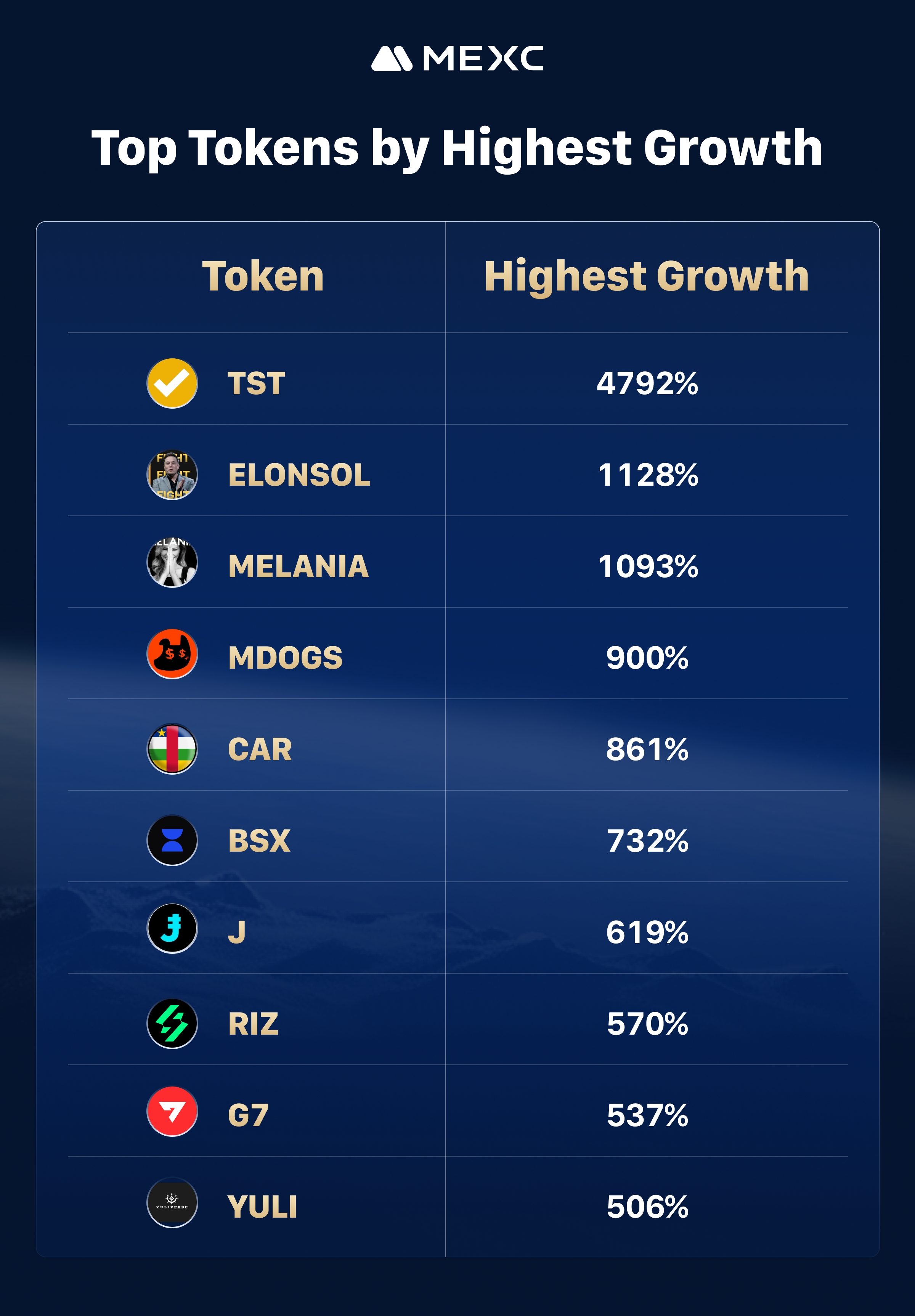 Celebrity and politically themed memecoins demonstrated significant price surges, with four of the top five best-performing tokens — TST, ELONSOL, MELANIA, and CAR — linked to public figures. The top three memecoins (TST, ELONSOL, and MELANIA) recorded an average peak increase of 2,338%, compared to 640% for the top three non-meme tokens (BSX, J, and RIZ).