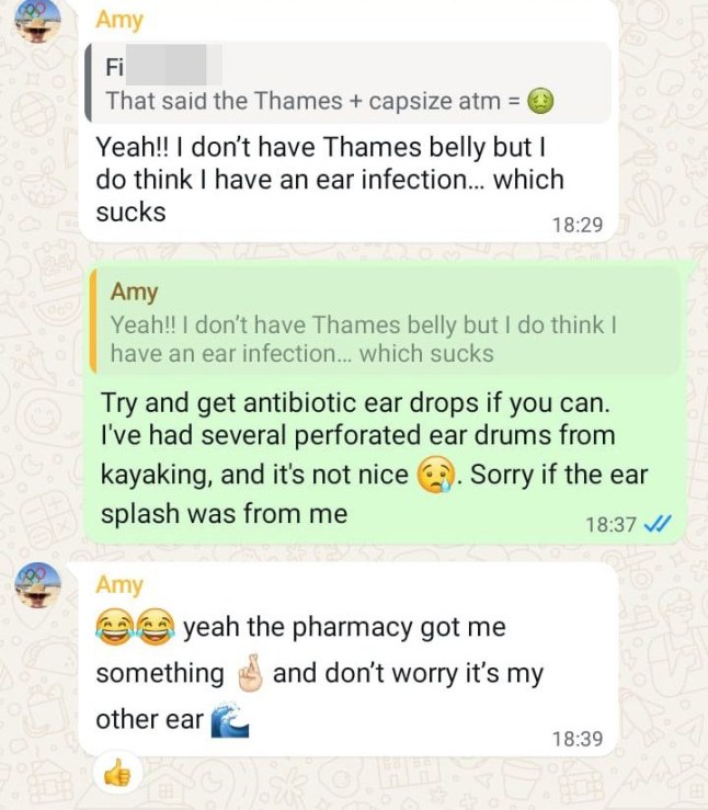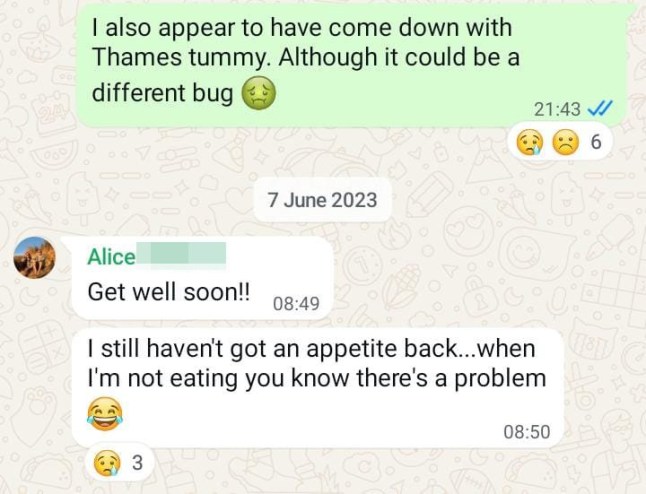 She shared Whatsapp messages from teammates in June 2023,after five of them became unwell at once with what they dubbed ‘Thames Belly’.