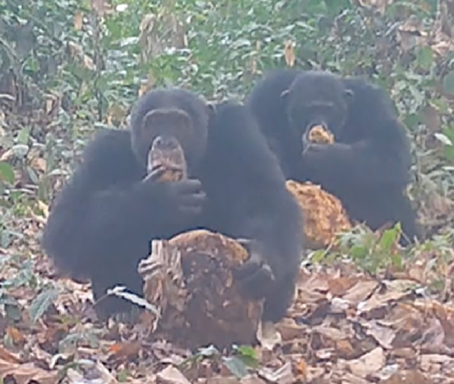 The chimps were filmed enjoying themselves in the west African jungle in Guinea Bissau’s Cantanhez National Park.