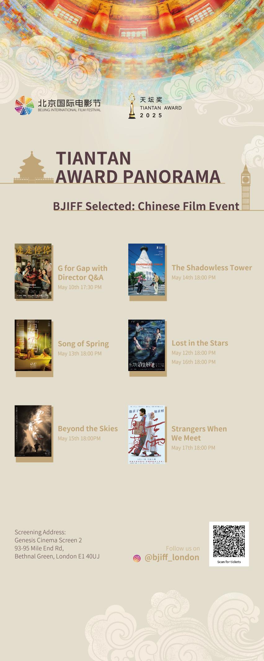 From May 10 to 17, the “Tiantan Award Panorama · London”, jointly organized by the China Film Administration and the Organizing Committee of the Beijing International Film Festival (BJIFF), was successfully held in the United Kingdom. The week-long screening featured six widely acclaimed Chinese films from recent years, covering multiple genres such as family, thriller, realism, and poetry. The featured films included G for Gap, Song of Spring, The Shadowless Tower, Beyond the Skies, Strangers When We Meet, and Lost in the Stars. These stories, originally from faraway Eastern lands, attracted many local viewers and Chinese residents in the UK in London cinemas. Despite differences in language and background, emotional connections remain universal. As the distance between people narrowed in the light and shadow of cinematic imagery, understanding unfolded subtly.