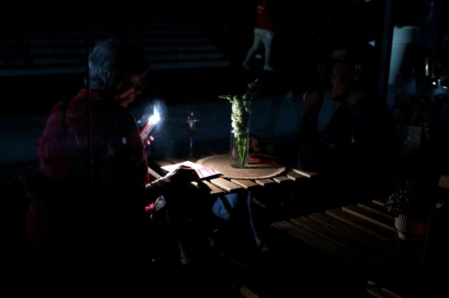 A woman uses her phone’s torch in the dark after the matches get suspended due to a power outage (Picture: REUTERS/Violeta Santos Moura)
