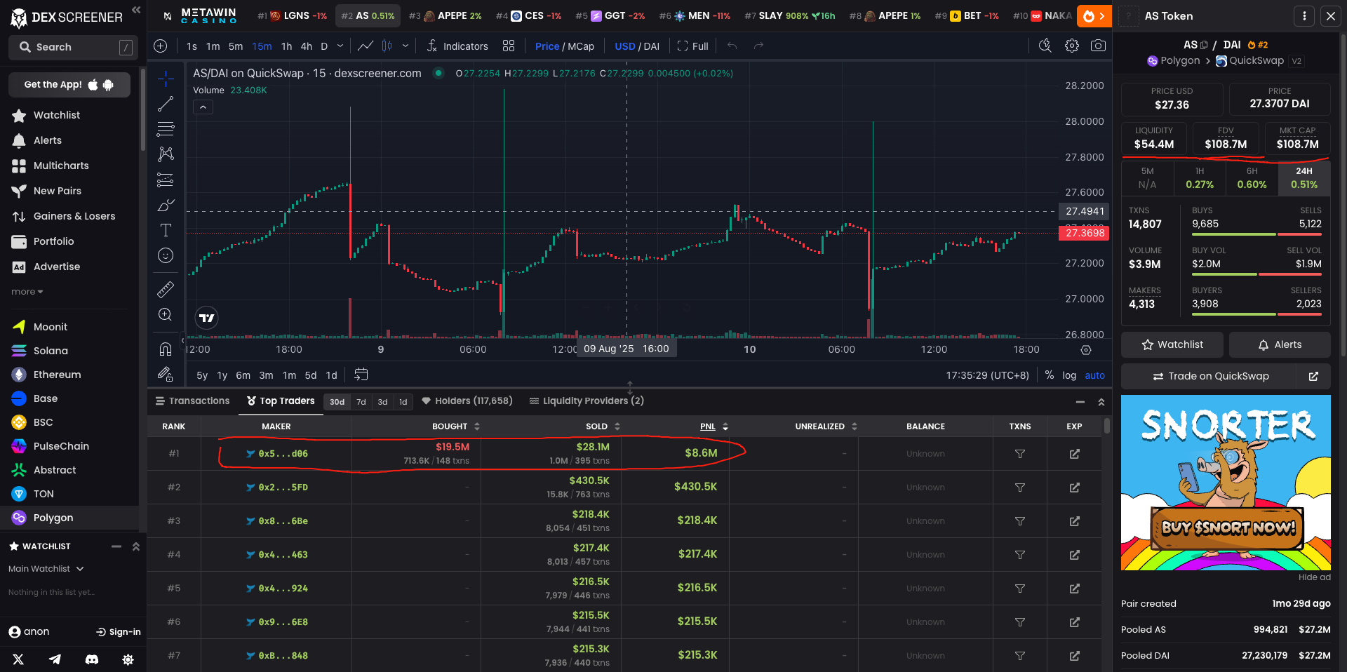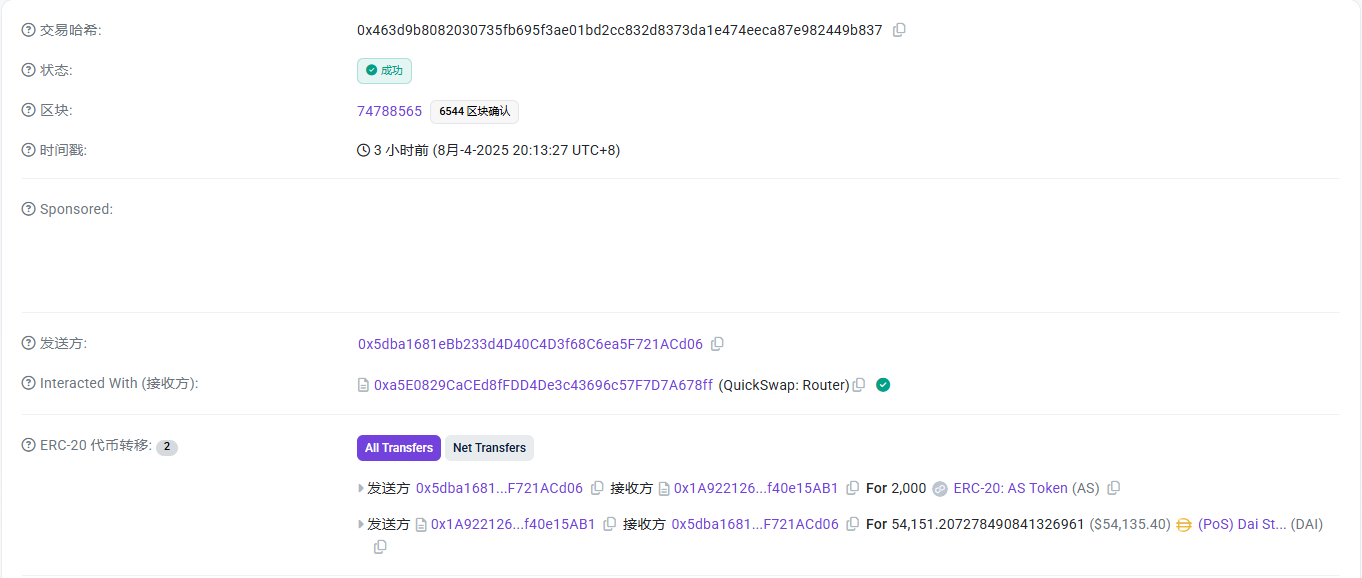Liquidity concentration is another big red flag. AS (AKAS token) on Polygon (0x6a92…b26e) mainly trades in a single AS/DAI pool on QuickSwap. On-chain data is clear: one heavily concentrated pool holds nearly all short-term volume, TVL, and FDV. This may look “stable” in fair weather, but it’s really stability on thin ice. A key wallet (0x5dba…ACd06) interacts heavily with this pool, regularly executing large DAI→AS swaps (visible via QuickSwap v3 routing). In other words, the market’s lifeline sits in very few hands.