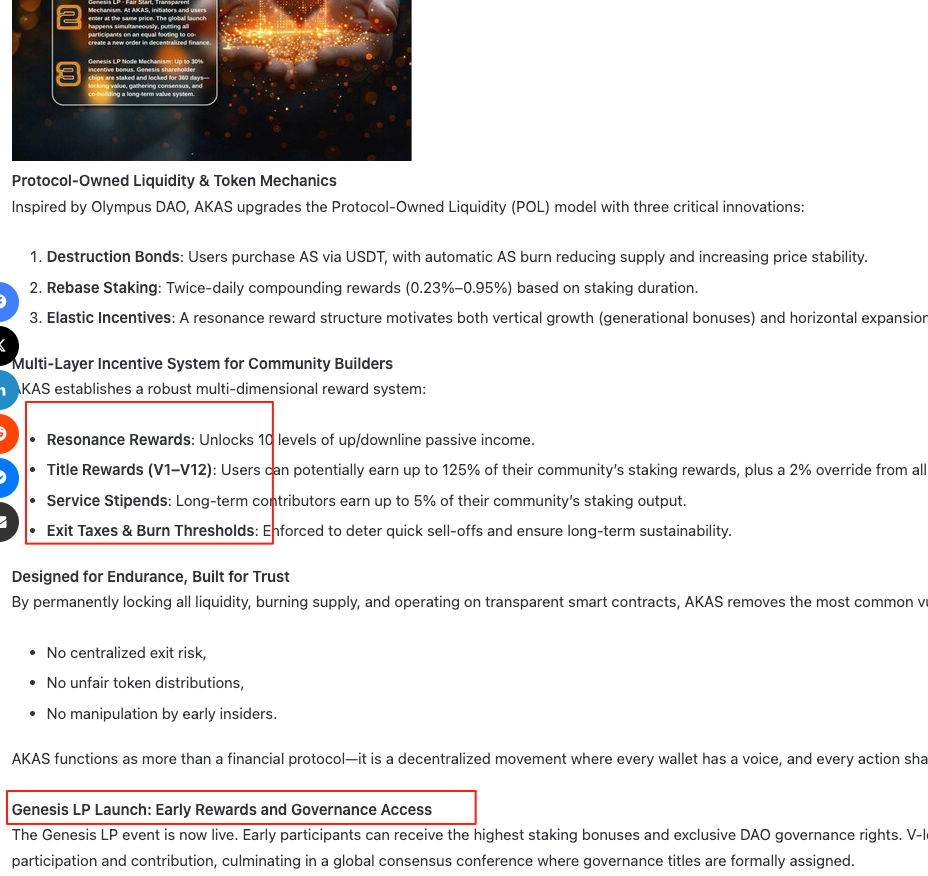 Spend enough time in crypto, and you’ll notice a pattern: the louder a project shouts “fair” and “decentralized,” the more you should dig into its on-chain details. AKAS Full-Chain Protocol is a prime example making waves recently. Its press releases hit all the investor-friendly buzzwords — global fair launch, no presale, permanent LP lock, up to 30% early bonus decreasing by 0.5% daily, and a “10-level resonance” community reward system — all backed by media coverage. For many who haven’t been burned yet, this reads like the “ideal” decentralized project template.
