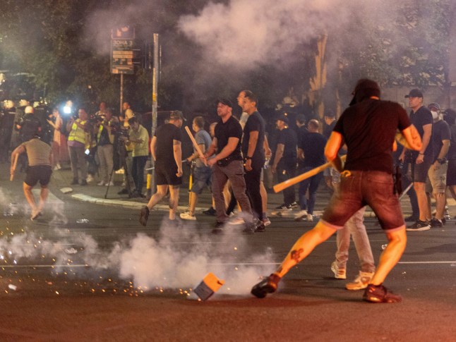 Supporters of Serbian President Aleksandar Vucic hurl flares at anti-government protesters (Picture: SIPA/Shutterstock)