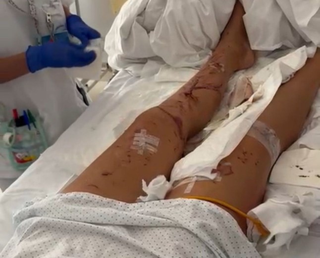 ‘She had an open fracture on her left knee where she’s got the staples which requires further surgery but they won’t do the surgery yet because she’s at high risk of infection.