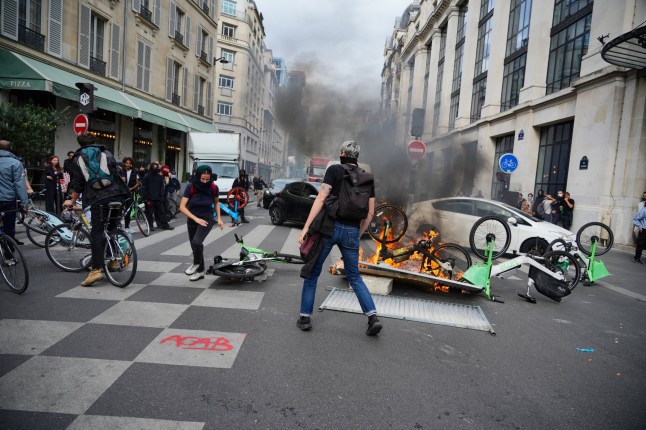 Rioters are seen throwing electric bikes on a fire to block traffic in Paris,France (Picture: Paris)