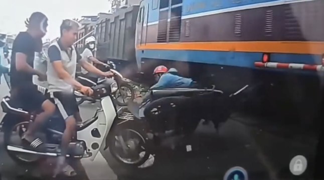 The biker was shown on CCTV footage being clipped by the passing locomotive as he crossed the railway in Hanoi,Vietnam.